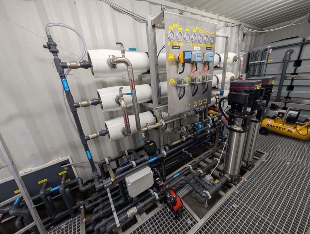 Osmoză inversă modulara in container sau skid utilizând elemente de membrană SWRO 8040, utilizând o treaptă de 40 bari sau 25 bari, pentru tratarea permeatului după treapta de levigat utilizând o o treapta de 90 bari DTRO bari sau o etapă de levigat SWRO 8040 de 82 bari.